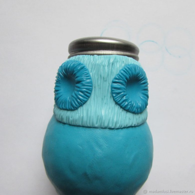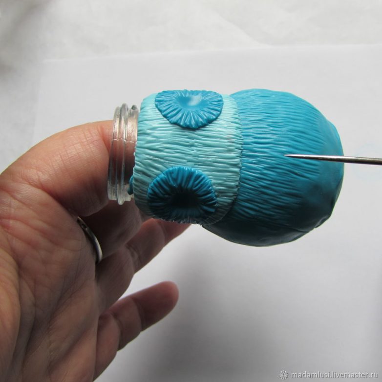Когда закончите глаза, начинайте текстурировать (делать насечки) на овале. Только соблюдайте правильное направление насечек. Оденьте крышку и пусть верхний край овала располагается немного выше чем нижняя линия крышки.