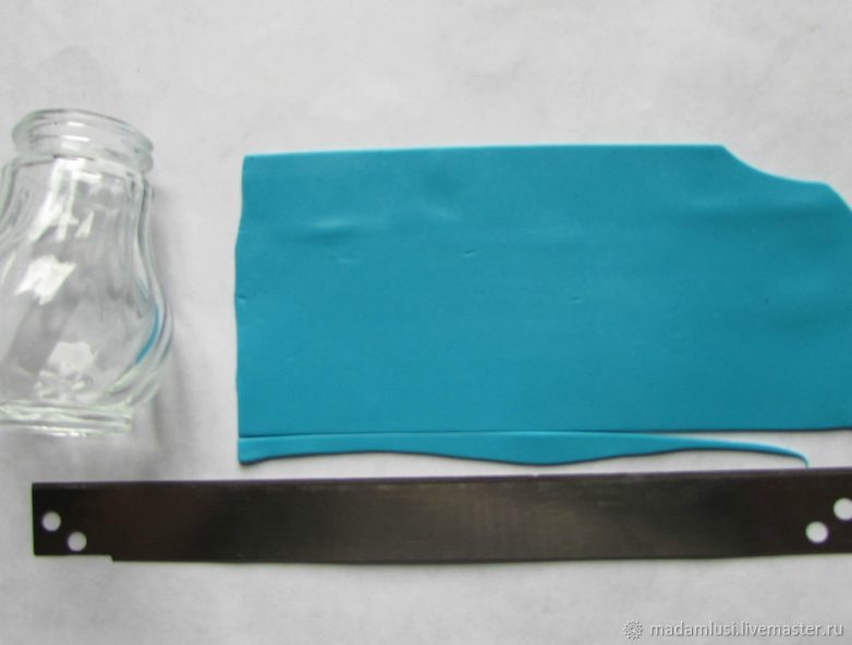 На паста-машине или с помощью скалки раскатайте глину в прямоугольный пласт толщиной примерно 2 мм такого размера, чтобы им можно было обернуть солонку. Пусть вас не смущает, если солонка имеет рифленную поверхность как у меня на фото. В конечном результате этого рифления не будет видно.