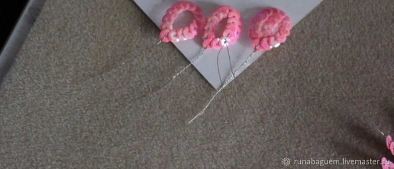 Теперь нужно заполнить серединку лепестка. В 7-ую пайетку с любого края вверху лепестка, обозначая, таким образом, центр, продеваем проволоку длиной 14 см и нанизываем, скрепляя поочерёдно, 4 розовые пайетки. Концы проволоки закрепляем у основания лепестка. Всего таких лепестков должно быть 6. На фото показан лепесток в процессе.