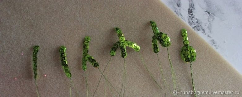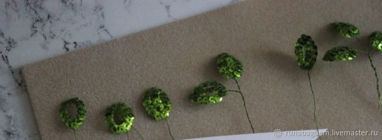 На отрезок зелёной проволоки длиной 30 см нанизываем, поочерёдно скрепляя каждую, 13 пайеток. Соединяем по форме листа, скручиваем проволоку для скрепления. Загибаем проволоку назад и заполняем середину листика — нанизываем ещё 4 зелёные пайетки. Пропускаем один конец проволоки в первую пайетку и скручиваем оба конца, закрепляя получившийся листик.
