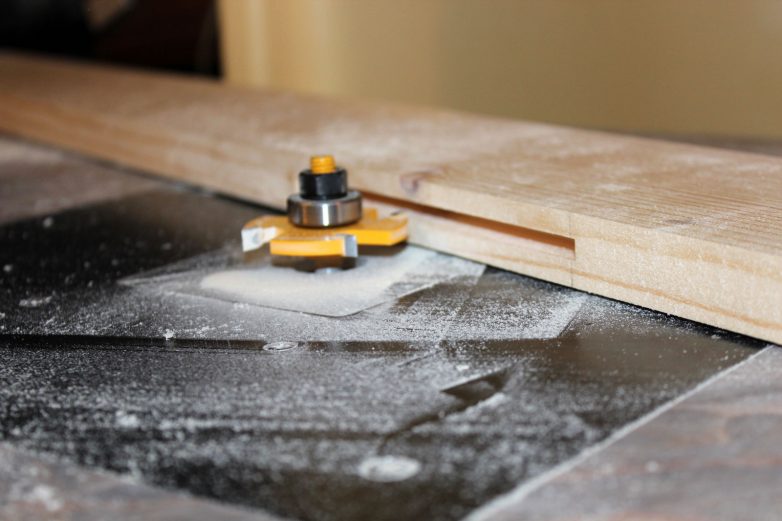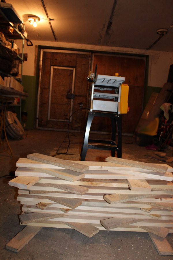 Далее приступил к изготовлению бортика – конструкции состоящей из двух параллельных досок соединённых перемычками. На самодельном фрезерном столе кромочной фрезой сделал пазы под фанерные ламели толщиной 6 мм.