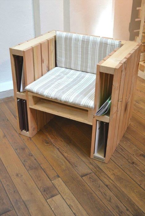 Детали старых паллет можно использовать для создания чудесного кресла с удобными полочками для книг и журналов, оборудованных в подлокотниках.