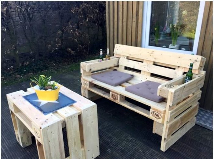 Столик и скамейка из деревянных поддонов.
