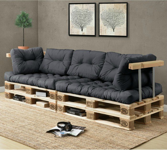 Большой комфортабельный диван, собранный из деревянных поддонов и украшенный мягкими стеганными подложками благородного серого цвета, станет эффектной деталью современной гостиной.