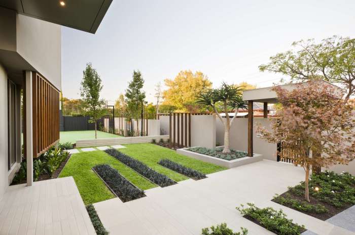 Невысокая стеклянная перегородка отлично впишется в современный садовый участок небольших размеров.