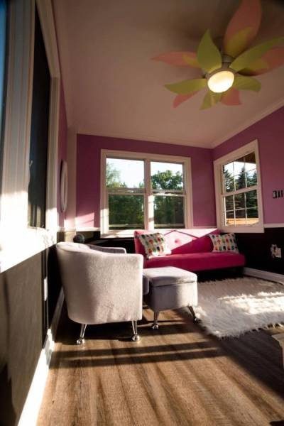 Внутреннее убранство домика оформлено в соответствии с пожеланиями девочек: стены окрашены в их любимые цвета. В самом домике настолько комфортно и приятно находиться, что к девочкам в гости часто заходят и мама с папой, и они всем вместе весело проводят время.
