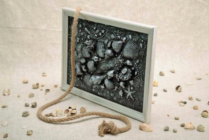 Великолепная композиция из ракушек, покрашенных оригинальными темными красками, в рамке для фотографии станет чудесным украшением рабочего стола и напоминанием о летних днях.