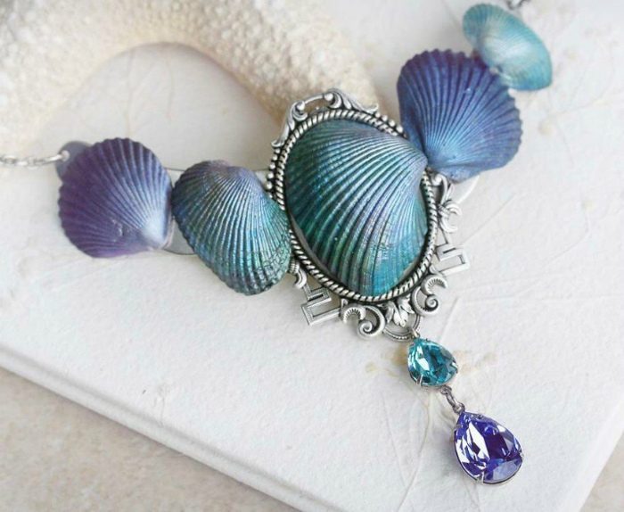 Великолепное колье из крупных и мелких ракушек, покрашенных в технике омбре, и специальной фурнитуры, станет уникальным и неповторимым украшением, которое подчеркнет вечерний образ.
