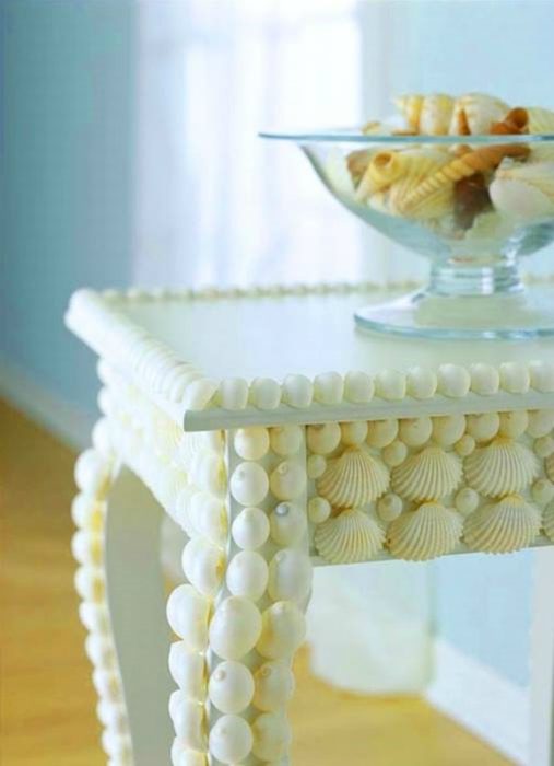 Ракушки, покрашенные в белый цвет, можно использовать для декора небольшого консольного или туалетного столика. Обновленный предмет мебели, несомненно привнесет свежести в интерьер городской квартиры.