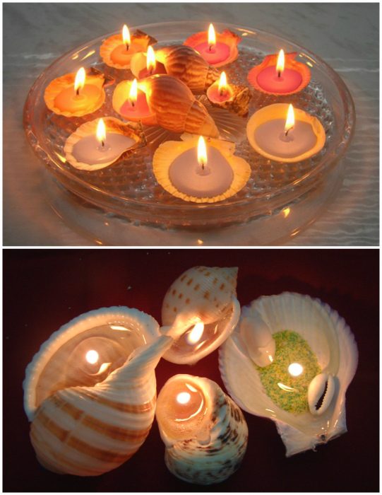 Из мелких морских ракушек, заполненных парафином и оборудованными фитильками, получатся прекрасные мини-свечи, которые можно использовать для создания чудесных декоративных композиций. Такие композиции можно использовать для создания романтичной атмосферы в ванной, для украшения журнального столика в гостиной, обеденного стола или прикроватной тумбы.