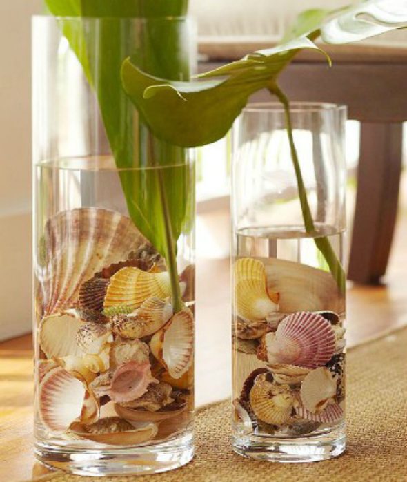 Крупные морские раковины можно использовать для создания потрясающей композиции, которая украсит журнальный стол и поможет создать романтичную атмосферу. Для реализации этой идеи, ракушки нужно тщательно вычистить, склеить, а во внутрь поставить свечи, лампочки или другие светящиеся элементы.