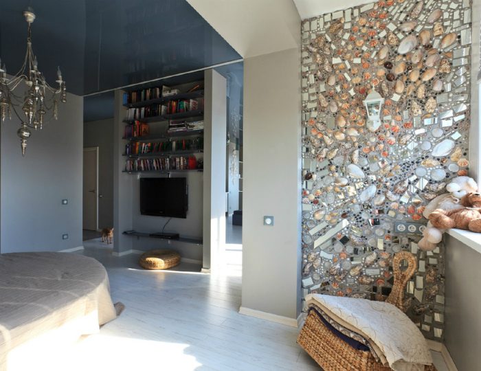 Ракушки, небольшие камни, шлифованные осколки и другие «сокровища», найденные на морском берегу можно использовать для декора одной из стен дома. Для реализации подобной затее, стену нужно подготовить, грунтовать, густо смазать качественным клеем и только после этого приступать к декорированию.