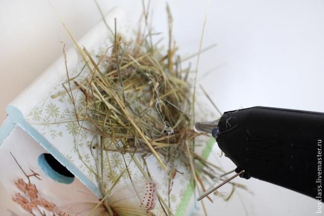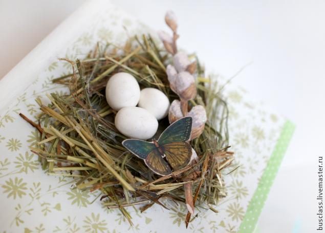 Украшаем крышу. С помощью клеевого пистолета приклеиваем рафию или сено в виде гнезда, подравняв лишнее ножницами, и помещаем в него три яичка из полимерной глины. Затем дополняем гнездышко декоративными элементами – вырубкой в виде веточки вербы и бабочкой.
