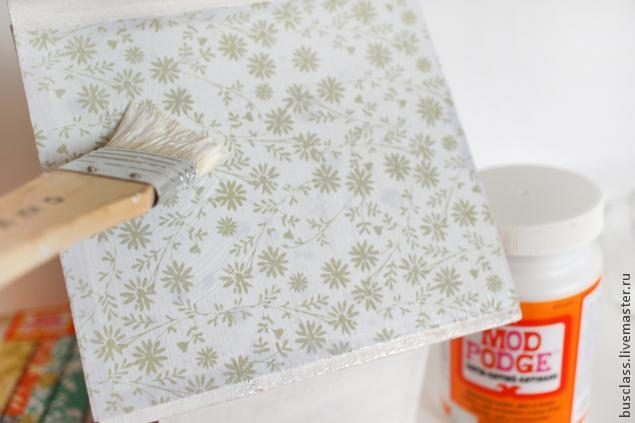 Крышу декорируем с помощью декупажа. Для этого выбираем понравившийся мотив из большого разнообразия декупажных карт. На минуту опускаем карту в воду, смазываем декорируемую поверхность клеем для декупажа и аккуратно приклеиваем бумагу. Разглаживаем и наносим еще слой клея. Я использую клей-лак для декупажа, это очень удобно, плюс ко всему он не имеет запаха и быстро сохнет.
