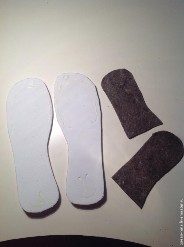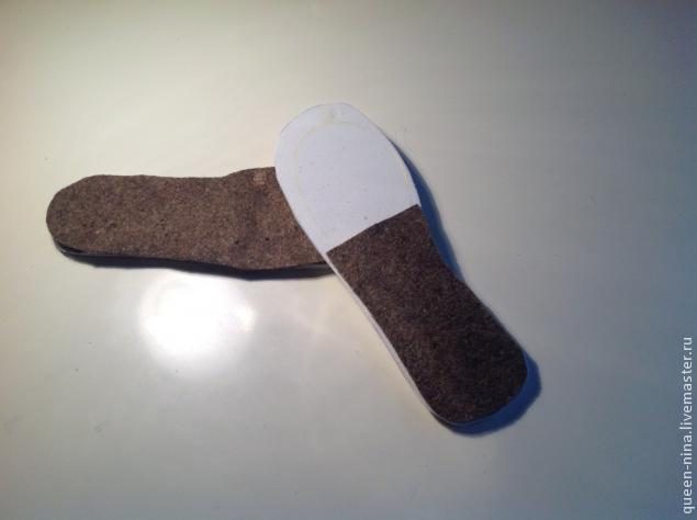 Переходим к подметке. Вырезаем по выкройке подметки еще стельку из тонкого войлока 2 шт и две полустельки. Приклеиваем стельку и полустельку из войлока к подметке из одноразовых тапок. Клея не жалеем промазываем как следует обе склеиваемые поверхности. Полустелька нужна только для того, чтобы пятка была чуть повыше. Можно думаю еще под пятку подклеить тоненький поролон (если кто-то любит повыше).