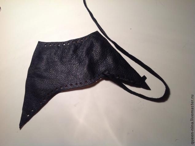 Далее вооружаемся пробойником и начинаем на расстоянии 1см друг от друга и на расстоянии 0,5 см от края пробивать отверстия на деталях верха в области подъема и пальцев. Вырезаем полоску кожи толщиной 7 мм, вдеваем в иглу и прошиваем через каждое отверстие кожей (в этот раз у меня кожа оказалась достаточно толстой и не продевалась в иглу, зато довольно легко продевалась в отверстия и без иглы). Кончики кожи подклеиваем моментом на изнанке.