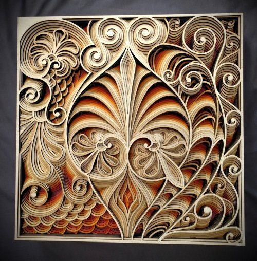 Из тонких слоёв фанеры он создаёт замысловатые трёхмерные декоративные картины с геометрическими формами и разноцветной расцветкой.