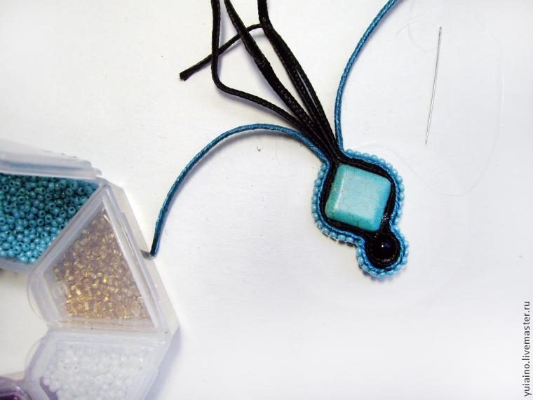 7. Далее берем бисер. Следует подобрать ровные бисеринки, тогда ваше украшение будет смотреться ровнее и аккуратнее. На наружную сторону выводим иголку с мононитью, одеваю бисер и пришиваю к слоям сутажа. Затем возвращаемся через эту же бисеринку на наружную сторону и одеваю следующую бисеринку. Так ровным шагом пришиваем бисер по всему сутажному шнуру вокруг кабашона и бусины.