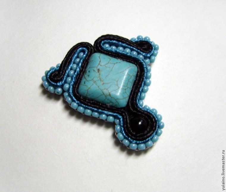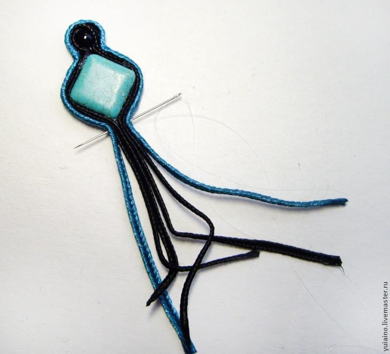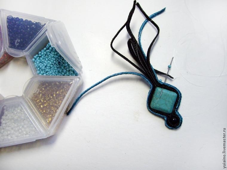 3. Далее пришиваем сутажный шнур с бусиной к основе вокруг кабашона, выводя иглу строго в середине бороздки сутажной тесьмы. Следите за тем, чтобы сутаж ложился ровно вокруг камня.