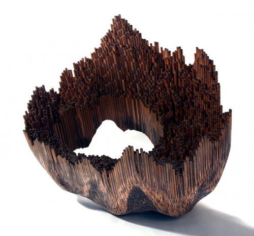 Только заглянув внутрь органично-выглядящих скульптур Джесски Дренк (Jessica Drenk) понимаешь, из чего они изготовлены: здесь карандаши остались практически нетронутыми и вполне узнаваемы, в то время, как расположенные вдоль внешней части скульптур были вырезаны и отшлифованы так, что получились необычные новые формы. Для создания каждой скульптуры Дренк использует электрическую шлифовальную машинку, каждый раз попадая под осколки разрывающегося графита. «Трансформируя привычные объекты в формы, вдохновленные природой, я изучаю, каким образом мы классифицируем окружающий нас мир, — говорит она. – Искусственно созданные объекты выглядят как созданные природой, нечто функциональное принимает облик чего-то декоративного, простой материал становится сложным, а банальность становится уникальной».