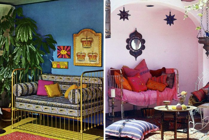 Старую металлическую кровать можно легко превратить в оригинальный диванчик в стиле бохо. Все, что потребуется для реализации этой задумки: новые матрасы, перетянутые яркой тканью и краска для обновления деталей кровати.