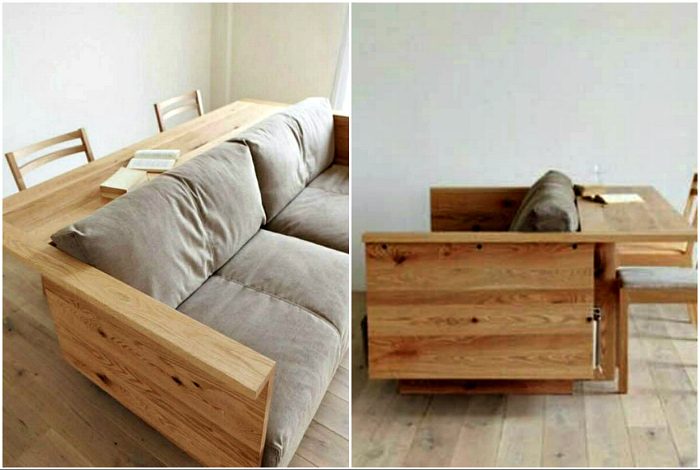 Потрясающий диван из натурального дерева со спинкой-полкой, которая может выполнять функции рабочего места или обеденного стола, станет стильной и функциональной деталью небольшой гостиной.