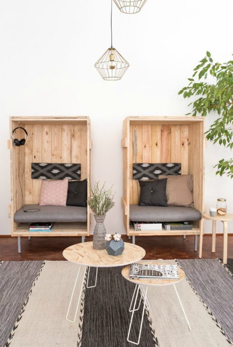 Очаровательные и весьма оригинальные кресла, которые можно сделать из деревянных досок и мягких мебельных накладок, станут креативной деталью интерьера интроверта.