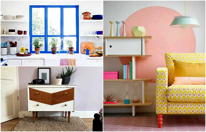 Покрасьте в яркие цвета рамки тумбочек и полочек. Такие незначительные, на первый взгляд, детали, благотворно скажутся на интерьере жилья и привнесут в него яркие краски.