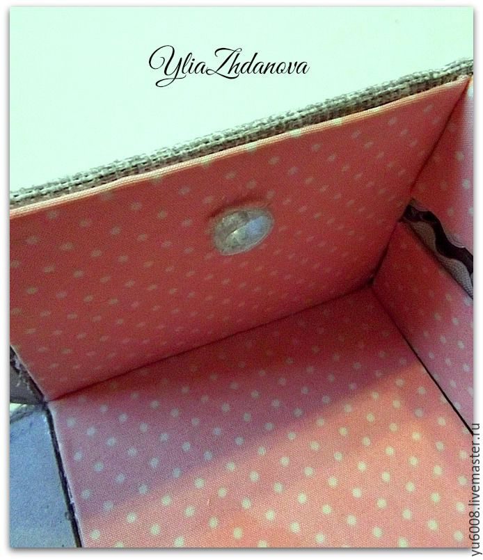 Изнутри закрыла все декоративной вставкой. Взяла для этого пивной картон, нарезала полоски по внутреннему размеру, обклеила бязью в горошек, чтобы перемычки не так бросались в глаза, сделала «зубки дракона» из ленты «вьюнок». К сожалению, количество фотографии ограничено, поэтому как оформить внутреннюю часть кармана, более подробно можно посмотреть здесь >>.
