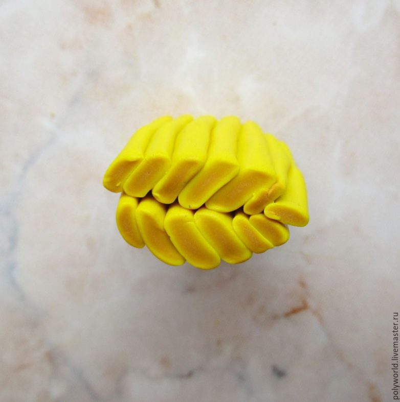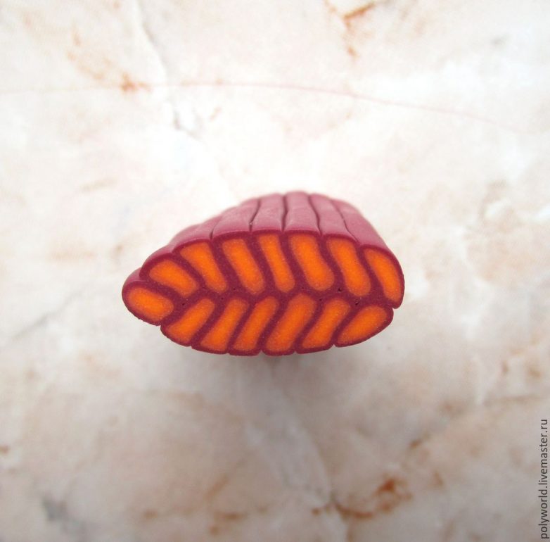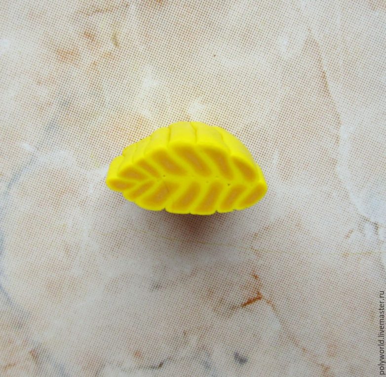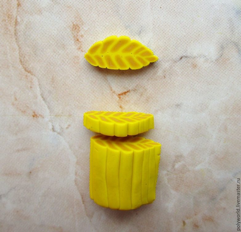 Соберём заготовку из кусочков обратно и плотно сожмём, получились жёлтые прожилки. Некоторая асимметрия в прожилках делает лист более натуральным, на мой взгляд. Нарезаем заготовку на кусочки 4-5 мм, с помощью иглы и фактурного листа (я взяла другой, чтобы листики отличались не только цветом) оформляем наш листик.