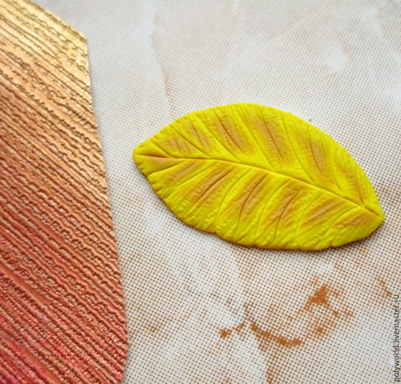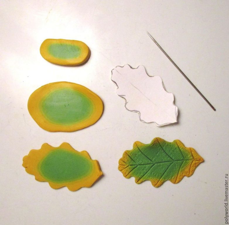 Следующий, четвёртый тип листочков — дубовые. Делаются подобным же образом, используем цвета — смесь жёлтого и охры плюс неяркий зелёный. Одно отличие от предыдущих — контур листика вырезается из подготовленного кусочка заготовки по бумажному шаблончику, нарисованному и вырезанному заранее. Ножом такие мелкие изгибы вырезать неудобно, поэтому делаю это острой иглой, держа её вертикально, тонкий слой глины отлично прорезается.