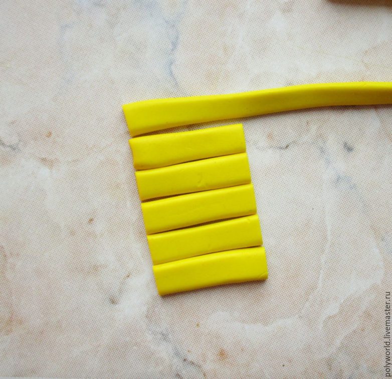 Возьмём два довольно близких цвета — жёлтый и охру, отрежем по одной полосочке (это примерно по 10 гр), от каждого из этих кусочков отрежем по трети. Эти трети соединим вместе и смешаем до однородности, у нас получится ещё один промежуточный цвет. Каждый из трёх цветов хорошенько разомнём и вытянем в колбаски толщиной 5-6 мм. Колбаски уложим рядом, прижмём друг к другу. Полученный брусочек немного расплющим до толщины 4 мм, после чего его можно начинать раскатывать в паста-машине.