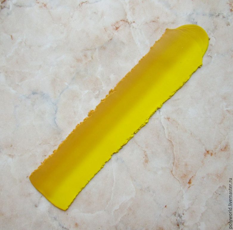Тонкую ленточку сматываем в колбаску, начиная с тёмного края. Полученный цилиндр аккуратно и постепенно уминаем и растягиваем, нужно, чтобы он стал длинным и узким, кроме того, его нужно расплющить. Один край делаю потоньше, чем другой. В итоге у меня получилась заготовка длиной 39 см, шириной от 5 до 7 мм и толщиной 2 мм. Вся красота перехода цвета осталась внутри и пока не видна.