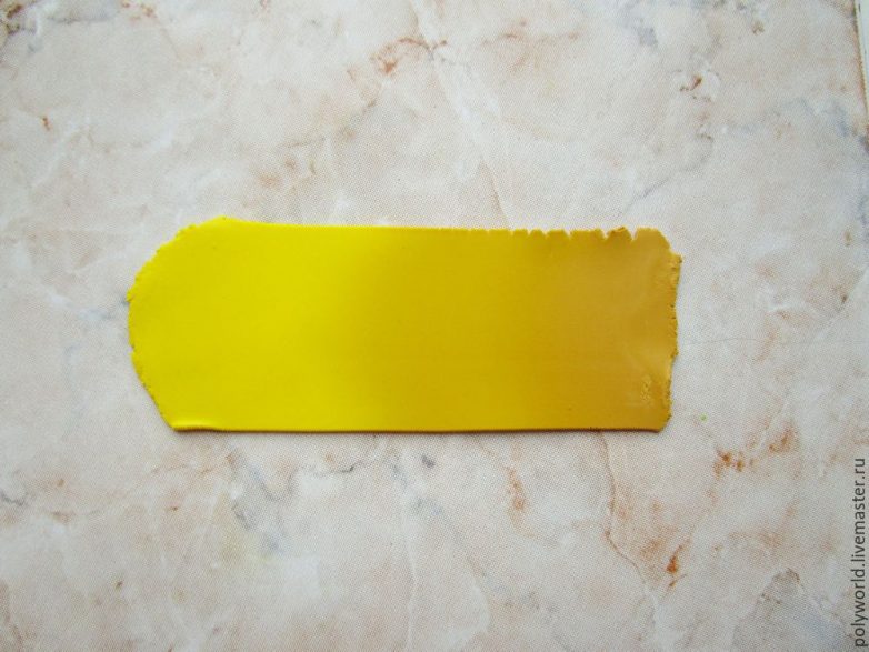 Эту заготовку сильно ужимать не нужно, ведь нам нужны листики не такие уж маленькие. У меня срез имеет размер 2,5 см на 1,5 см. Отрежем кусочек шириной 4-5 мм, это один будущий листик. Этот кусочек нужно аккуратно расплющить на гладкой рабочей поверхности, сначала пальцами, затем ещё немного скалкой или паста-машиной. Через паста-машину лучше прокатать 2 раза, вдоль и поперёк, уменьшая толщину (у меня до цифры 4), чтобы сохранить пропорции листка.