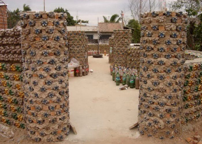 Бутылки наполняли песком, а потом укладывали в цементный раствор. Для дома в несколько комнат их понадобилось несколько десятков тысяч штук. Для строительства внутренних перегородок в ход шли и стеклянные бутылки.