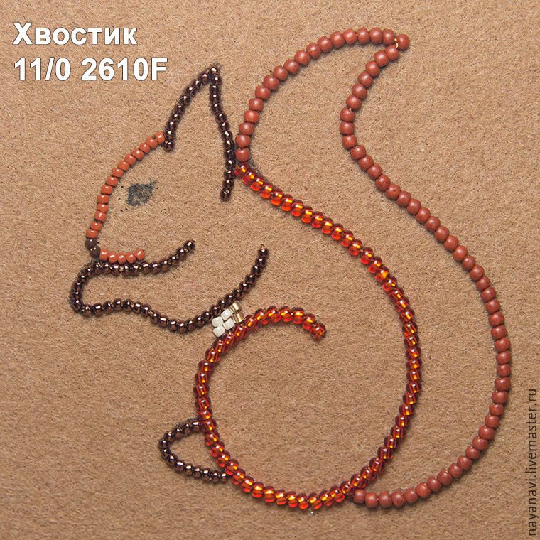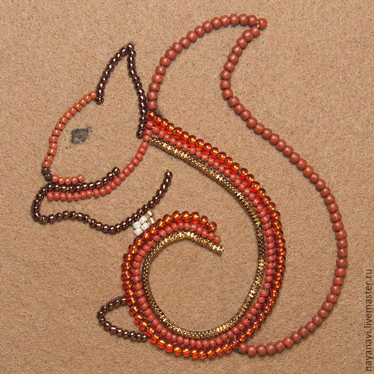 Таким образом вышиваем контур бедра и спинки нашей белочки, используем чешский рыжий бисер «огонек».