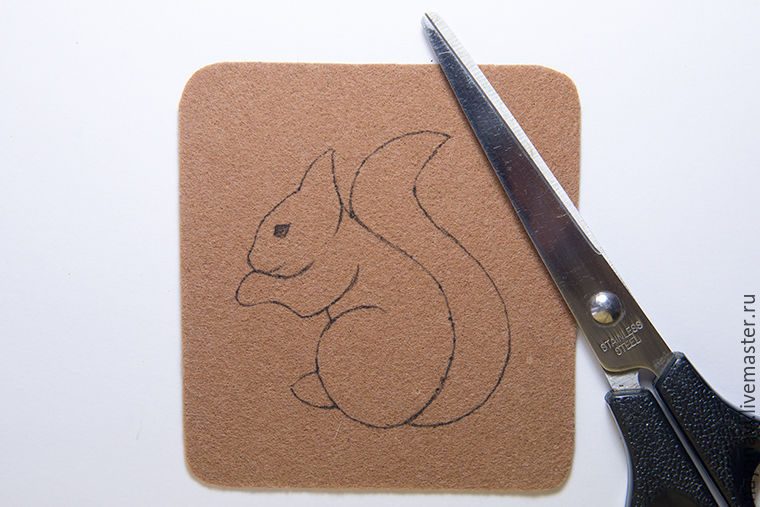 Обведите по контуру всю белочку. Линию спинки перевести тоже просто: сделайте в бумажной заготовке дырочки иглой и через них поставьте на фетре точки. Потом просто соедините их.