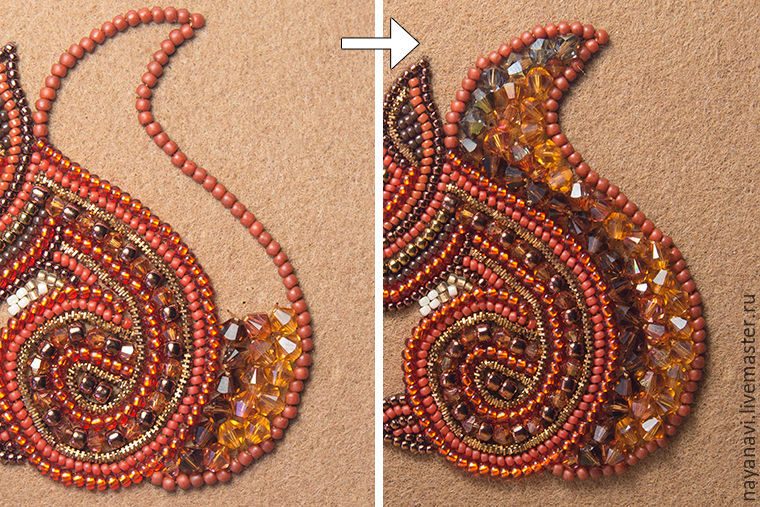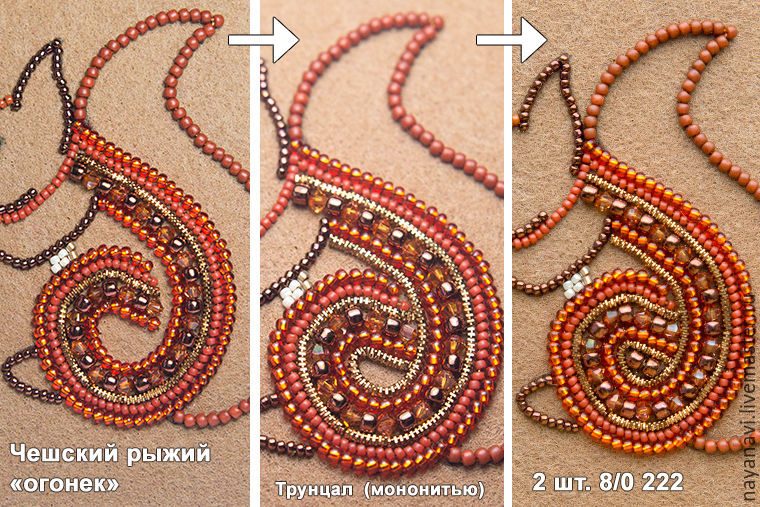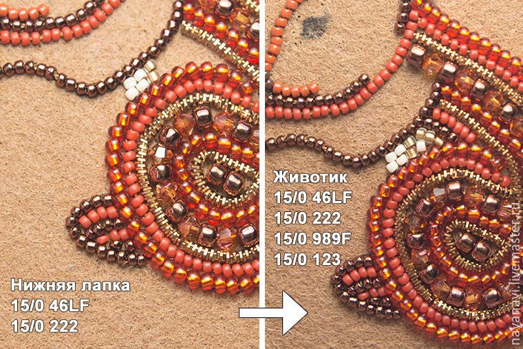 Верхняя лапка вышивается рыжим «огоньком», мелким темно-коричневым бисером и светлой бронзой: