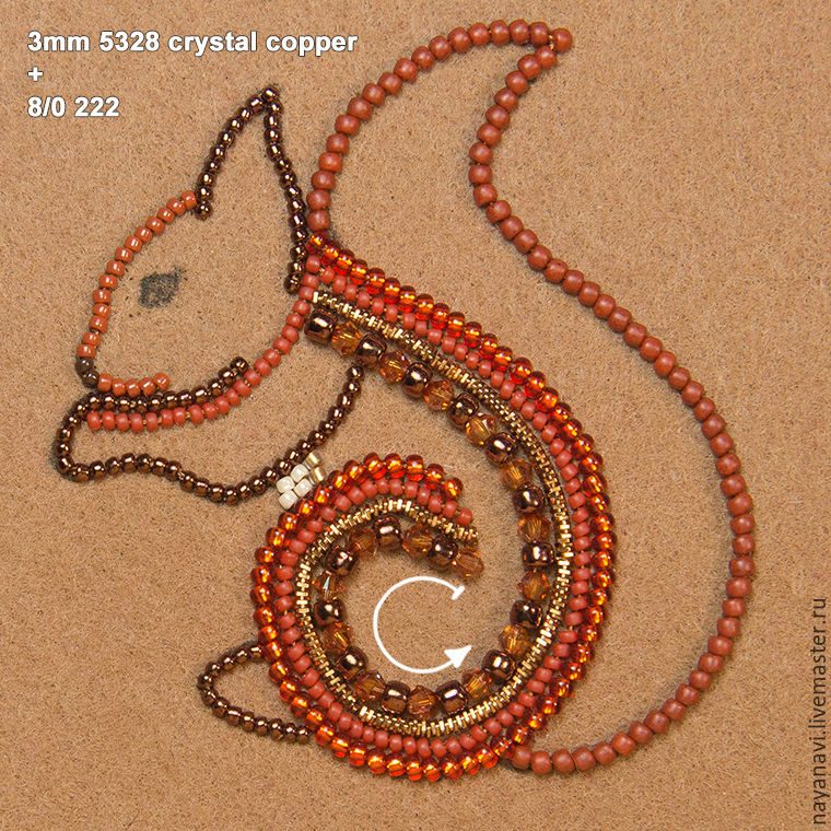 Пришивать эти кристаллы в пределах ограниченного пространства может быть непросто. Если бусинки совсем не стыкуются, на помощь придут 3 мм кристаллики crystal copper. Мне пригодились в хвосте 4 штучки: