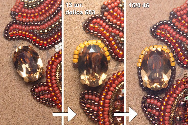 Пришиваем кристалл к основе между верхней и нижней лапкой белки.