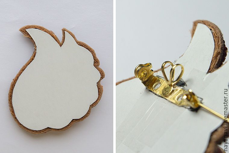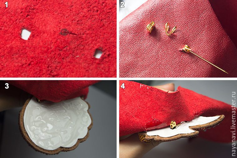 На кусочке кожи нужного размера отметьте и вырежьте острым ножом и/или ножницами отверстия-квадратики под элементы заготовки для броши (пункт 1). «Наденьте» кожу на заготовку (пункт 2). Поэтапно промазывайте картон клеем и прижимайте кожу — сначала под заготовкой (пункт 3), потом над ней и ее саму (пункт 4). Оставьте высохнуть.