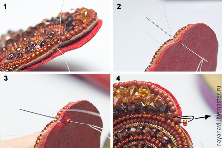 3. Наберите одну бисеринку, отступите от места прошлого прокола расстояние в одну бисеринку и пройдите сквозь кожу и фетр