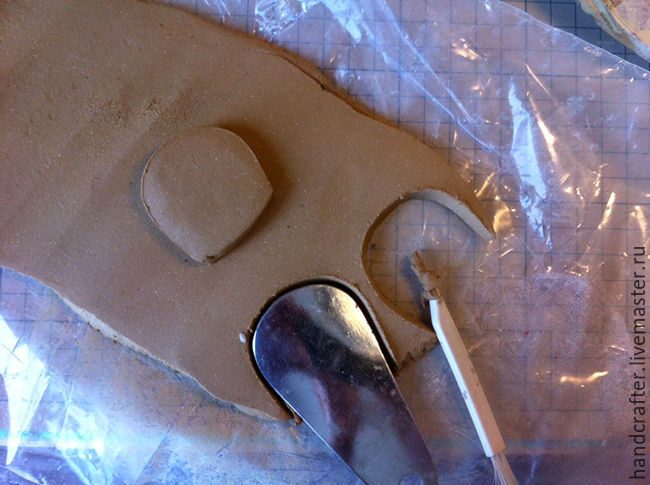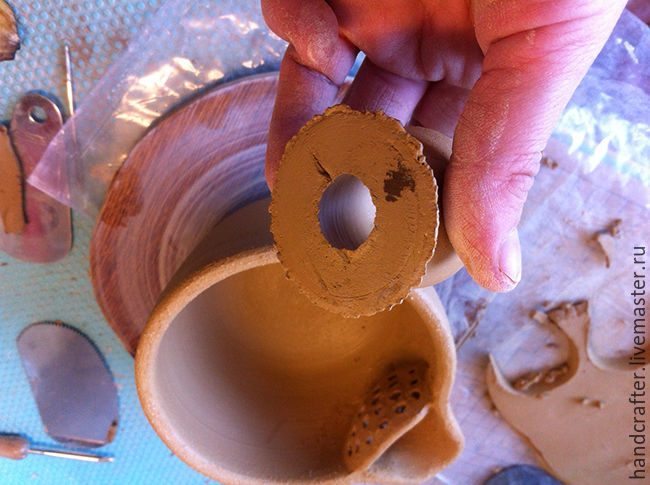 Формируем носик ковша подходящим предметом (можно той же деревянной ручкой), затем раскатываем пласт глины и вырезаем по шаблону (у меня это обувная ложка) будущее ситечко. Делаем отверстия в заготовке.