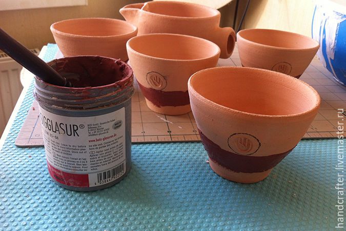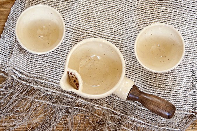 Затем ковш и пиалы сохнут и ждут своей очереди в печку. После обжига «на бисквит» покрываем будущий набор глазурью. У меня это немецкая пищевая глазурь Botz, но тут, опять же, кто к чему привык.