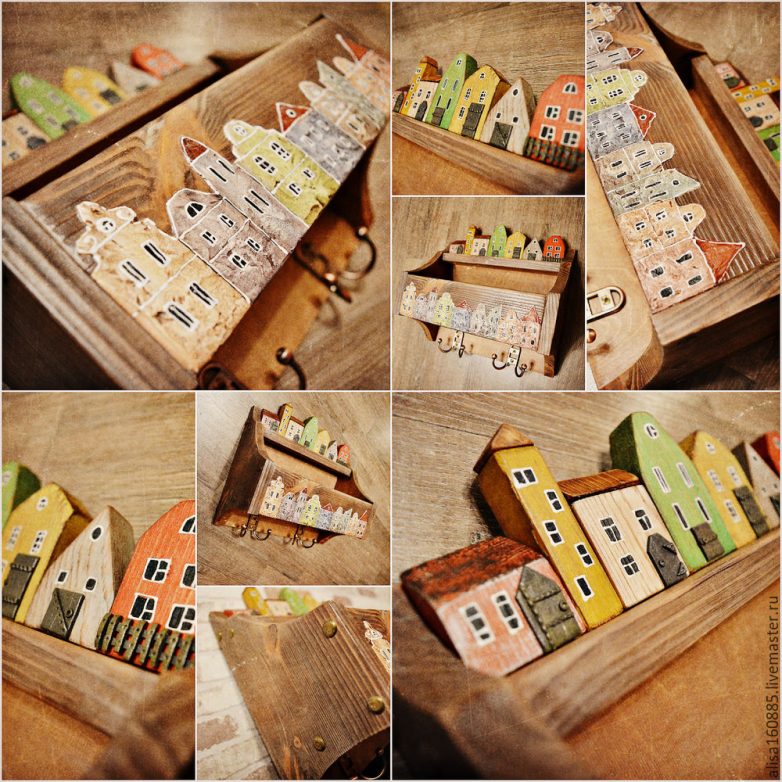 Собираем все детали. Перед этим покрываем лаком полочку, шкурим мелкозернистой наждачной бумагой, удаляем пыль. Приклеиваем домики к полочке, крепим крючки к нижней части. Шурупы на торцах полочки маскируем под шляпками декоративных гвоздей. Для этого кусачками убираем ножку у гвоздя и приклеиваем шляпки к поверхности.