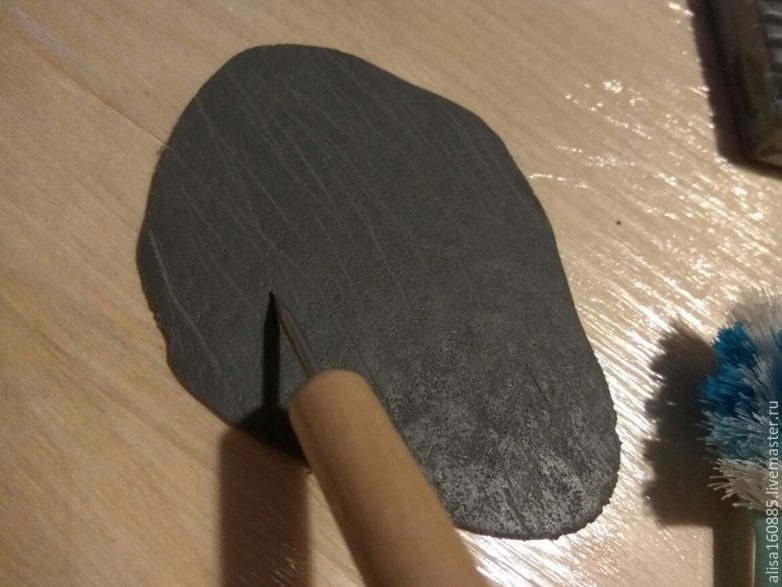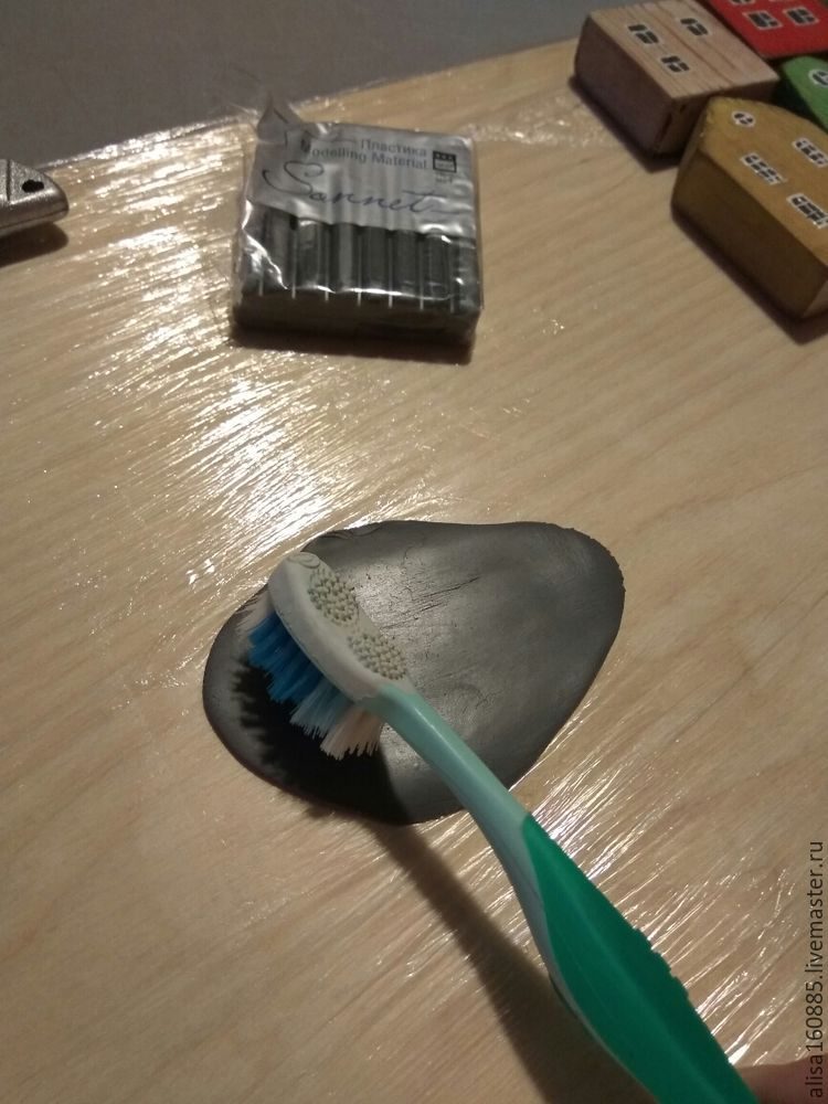 Из полимерной глины сделаем мелкие детали для домиков. Для этого нам понадобится полимерная глина, скалка (у меня обрезок пластиковой водопроводной трубы), канцелярский нож, старая зубная щетка, стек или зубочистка, чистая ровная поверхность для работы. Глину разминаем и раскатываем тонким слоем (2 мм). При помощи зубной щетки, стека или зубочистки придаем поверхности фактуру. Канцелярским ножом нарезаем пласт на полоски нужной ширины.