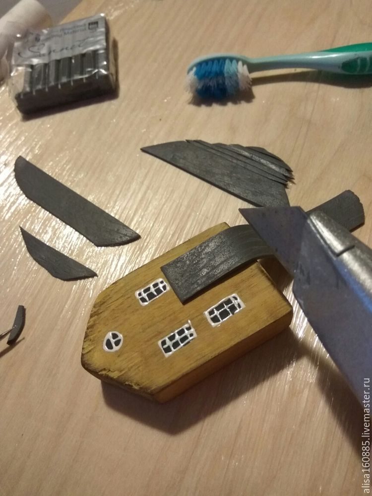 Берем домик, полоску глины и обрезаем до нужного размера прямо на заготовке. Добавляем мелкие детали, дверные ручки, тонкие полоски, имитирующие ковку. Закрепляем их на поверхности стеком или зубочисткой вдавливая в поверхность. По тому же принципу изготавливаем все детали. Полимерную глину можно заменить плотным картоном, окрасив и покрыв его лаком. Или просто нарисовать их на заготовках красками.Когда все детали будут готовы, необходимо запечь их согласно инструкции на упаковке глины. Соблюдайте технику безопасности, используйте стеклянную посуду и плотно закрытые пакеты для запекания.