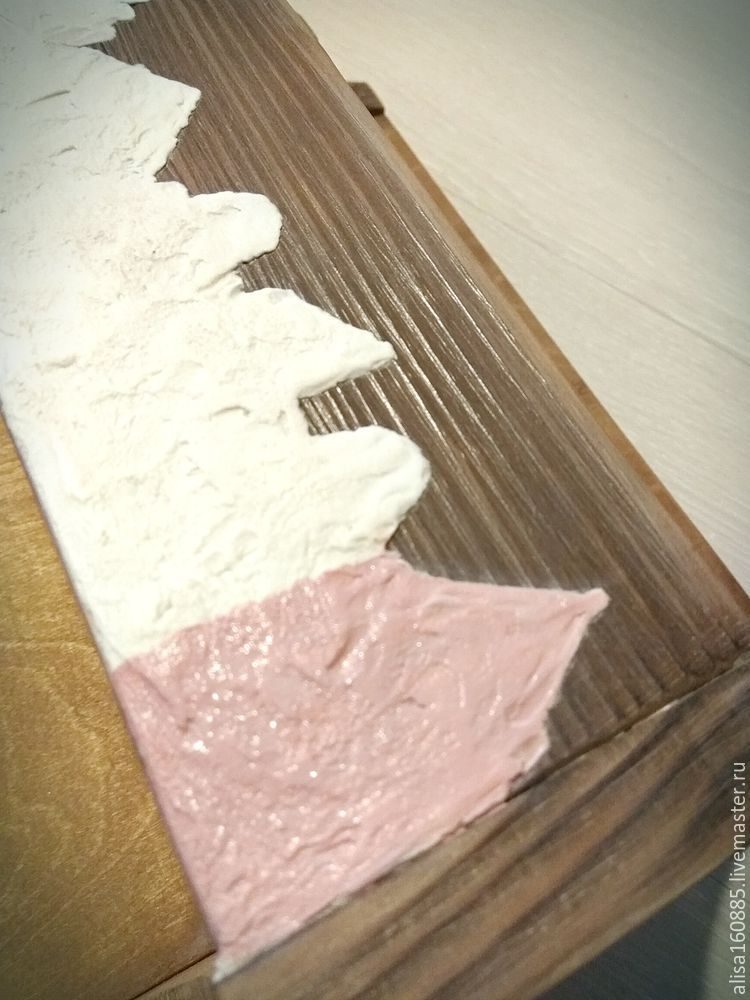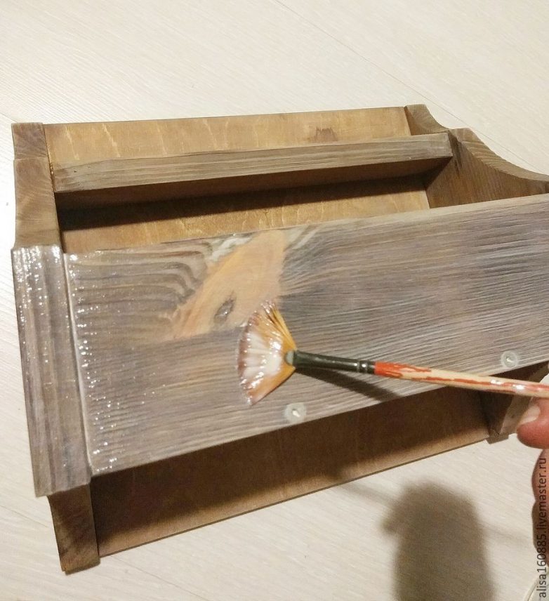 Дерево приобрело нужный нам цвет. Далее необходимо высушить краску, немного пройтись мелкой наждачной бумагой и удалить пыль. Покрываем полочку лаком в один слой.У меня полуматовый лак на водной основе. Наносить его необходимо тонким слоем вдоль волокон дерева. Ждем высыхания лака, шкурим, удаляем пыль. Полочка готова к дальнейшему декорированию.