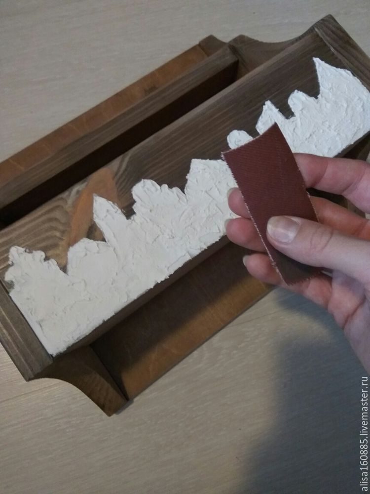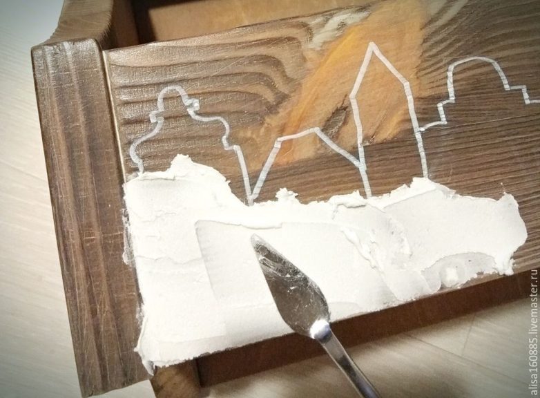 На переднюю стенку полочки мне захотелось нанести объемный рисунок. Ваша фантазия подскажет, что изобразить, у меня будет европейская улочка. Наносим силуэт будущего рисунка на поверхность. Затем по рисунку наносим шпатлевку. У меня универсальная белая. Наносить ее удобно небольшим мастихином, делая мазки в разных направлениях, чтобы получить рельефную поверхность. Оставляем изделие до полного высыхания, лучше на ночь.