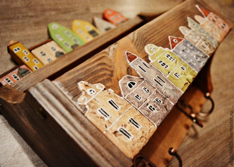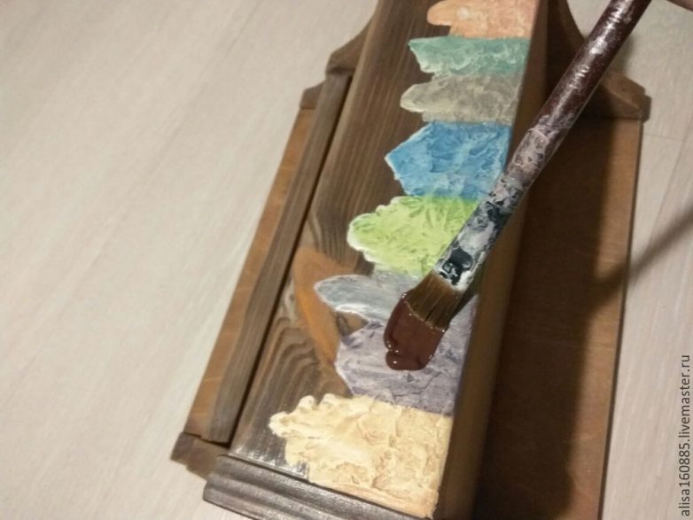 Чтобы наша улочка лучше вписалась в стиль изделия, немного состарим поверхность рисунка. Нанесем на поверхность коричневую краску. Ждем 5 минут и влажной салфеткой стираем краску с поверхности, она останется в углублениях и этого будет достаточно для нужного нам эффекта. Сушим, покрываем лаком, снова сушим.
